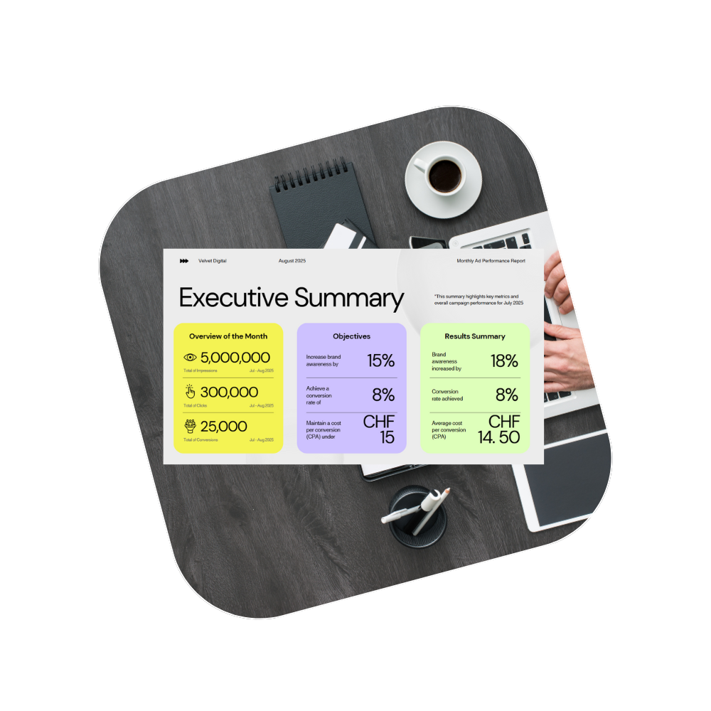 Velvet Digital – Deine Online-Marketing-Agentur aus Zürich, spezialisiert auf Performance Advertising, Social Media und Online Marketing. Unsere Leistungen umfassen Webdesign, Online-Marketing, Google Ads, Meta Ads und Performance Advertising. Wir sind data-driven und seit über 10 Jahren Experten im Digital Marketing.